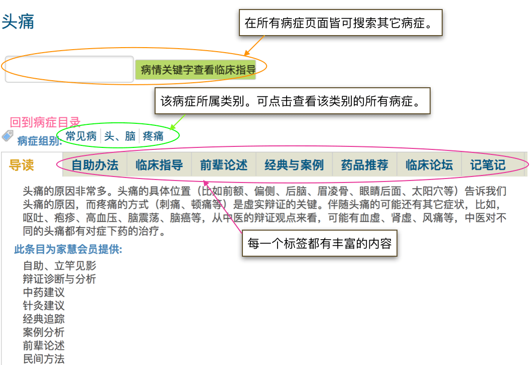 临床指导是一个极其重要的资源模块。我们囊括了大多数症状和疾病条目,每一个条目里都有丰富的论述帮助你从该病症入手。