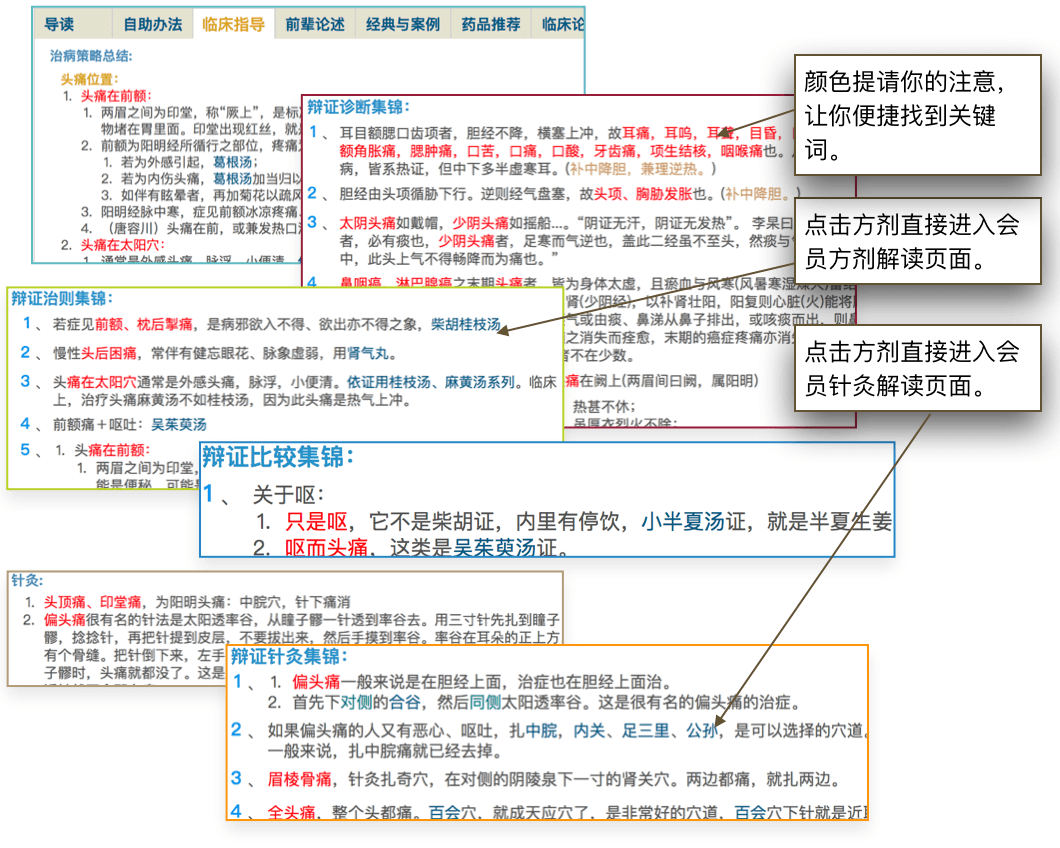 • 案例参考:案例学习是了解病症的非常重要的途径。在每一个病症条目下,我们都列出了若干相关案例。这些都是临床成功的案例。我们学习案例的时候,不要仅仅当作是故事来读,更要学其处方的原用和分析。很多案例甚至也是几经周折才最后确认有效的方法的。这个过程对于我们来说是宝贵的。我们要从其他人的诊断弯路中学习和丰富我们自己的辨证思路。