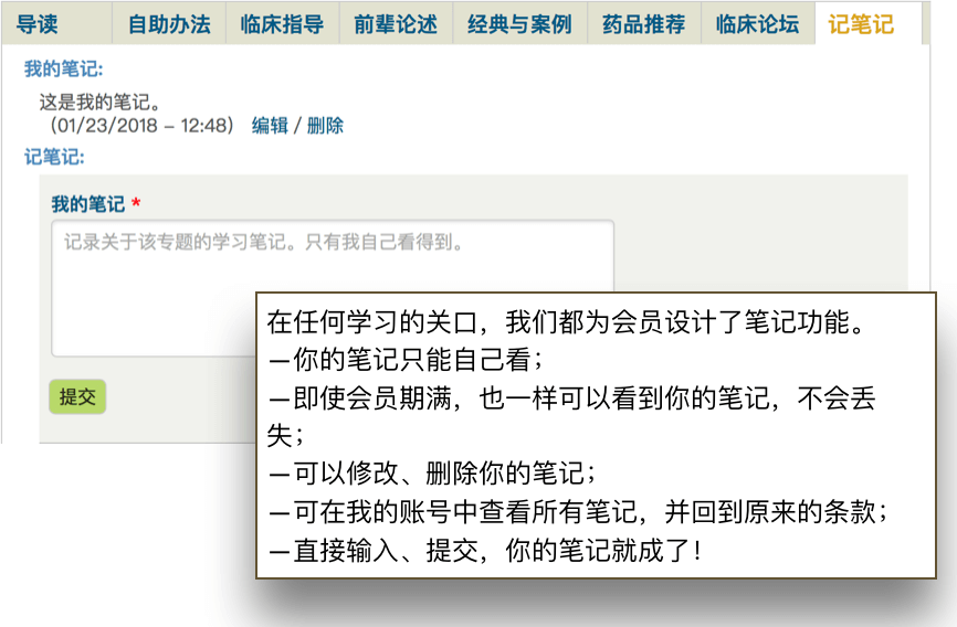 • 记笔记:记笔记也是专业会员的特权,您就可以在任何经典条目、方剂、草药、针灸和病症专题中做笔记,可以随时修改和删除。即使在专业会员到期后,您做的笔记依然可见并可以修改。