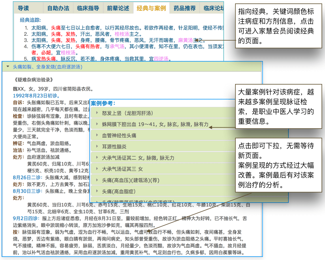 • 经典追踪:要真正地深入学习中医,就必须回归经典。我们有专门的经典学习板块。从病症条目,我们也尽量追逐到经典对该病症的论述。你点击每一条经典,就进入了经典的学习模式。你在中医越深入,就越发感叹,我们的祖先是如何聪慧。今天,我们已经在很多方面远远超越经典时代,但是对健康的认识,尚无人敢自诩超越经典的。事实上,对每一个中医人来说,尊敬经典是我们最基本的品德。