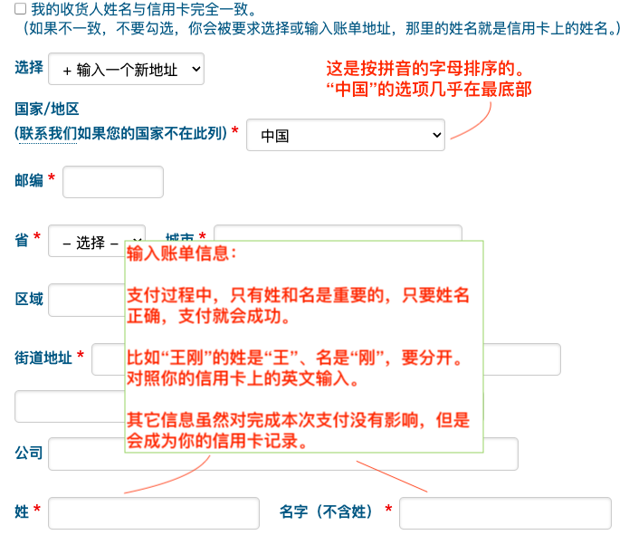 输入账单信息时,姓和名要分开,要与信用卡上的英文一致。比如,“王刚”的姓是Wang,名是Gang。其它信息对本次支付没有影响。